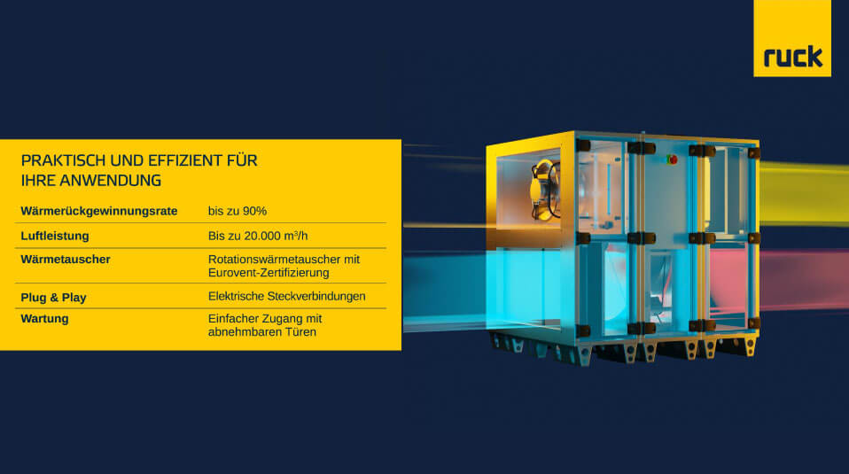Die erweiterte ROTO K Baureihe von Ruck repräsentiert einen bedeutenden Fortschritt in der Lüftungstechnik. Diese fortschrittlichen Lüftungsgeräte zeichnen sich durch ihre höhere Luftleistung, kompakte Bauweise und teilbare Ausführung aus, was sie zur idealen Lösung für anspruchsvolle Anwendungen in verschiedensten Umgebungen macht. Ob in Gewerbe‑, Industrie- oder Wohngebäuden — die ROTO K Lüftungsgeräte bieten flexible und effiziente Lösungen, die den modernen Anforderungen an Luftqualität und Energieeffizienz gerecht werden. Mit Luftförderkapazität bis 20.000 m³/h und einer effizienten Wärmerückgewinnung von bis zu 90 % sind sie bestens für vielfältige Einsätze geeignet.