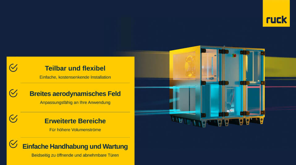 Die erweiterte ROTO K Baureihe von Ruck repräsentiert einen bedeutenden Fortschritt in der Lüftungstechnik. Diese fortschrittlichen Lüftungsgeräte zeichnen sich durch ihre höhere Luftleistung, kompakte Bauweise und teilbare Ausführung aus, was sie zur idealen Lösung für anspruchsvolle Anwendungen in verschiedensten Umgebungen macht. Ob in Gewerbe‑, Industrie- oder Wohngebäuden — die ROTO K Lüftungsgeräte bieten flexible und effiziente Lösungen, die den modernen Anforderungen an Luftqualität und Energieeffizienz gerecht werden. Mit Luftförderkapazität bis 20.000 m³/h und einer effizienten Wärmerückgewinnung von bis zu 90 % sind sie bestens für vielfältige Einsätze geeignet.