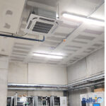 Das Kassettenmodell integriert sich durch sein Rastermaß unauffällig in abgehängten Decken. Der Luftansaug befindet sich an der Geräteunterseite über ein großflächiges Luftansauggitter mit dahinter angeordnetem auswaschbaren Langzeitfilter. Der Luftauslass erfolgt rundum an den Luftaustrittsöffnungen der Abdeckblende. Vier Luftaustrittsöffnungen sind mit motorisch verstellbaren Lamellen ausgestattet, die mit der mitgelieferten Fernbedienung individuell eingestellt werden können oder im ´Auto-Swing-Modus´ betrieben werden.
