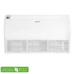 Geräteaufbau: Das Stand-/Deckenmodell integriert sich durch seine geringen Abmessungen und sein Kunststoffgehäuse unauffällig an jeder Decke. Der Luftansaug befindet sich an der Geräteunterseite (bei Deckenmontage) über ein großflächiges Luftansauggitter mit dahinter angeordnetem auswaschbaren Langzeitfilter. Der Luftauslass erfolgt an der Stirnseite über eine Kombination aus vertikalen und horizontalen Luftleitlamellen. Die motorisch betriebenen Lamellen für die dreidimensionale Luftrichtung, können mit der mitgelieferten Fernbedienung individuell eingestellt werden, oder im ´Auto-Swing-Modus´ betrieben werden.