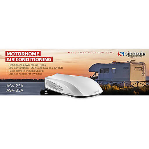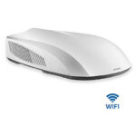Komfortable Dach-Klimaanlage für Wohnanhänger oder Wohnwagen. Kann zum Heizen oder Kühlen von bis zu 10 m langen Wagen bei geringstem Stromverbrauch und Anlaufstrom eingesetzt werden. Die elektrische Speisung erfolgt durch Anschluss an das 220–240 V Stromnetz. Das Gerät kann über Wi-Fi, Fernbedienung oder manuell bedient werden.