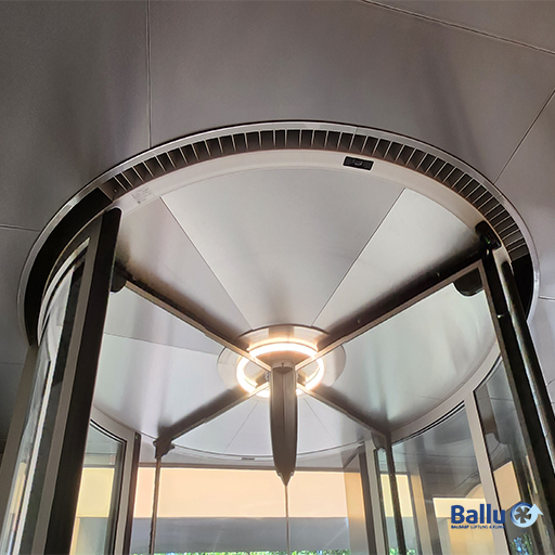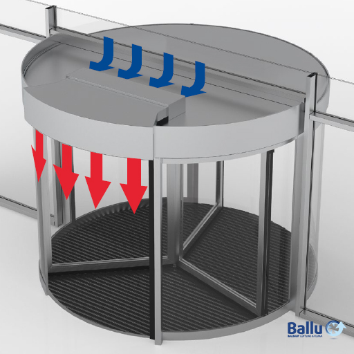 Durch eine Karussell-Drehtür wird zwar der kalte Winddruck auf den Eingangsbereich abgehalten, durch die Drehung wird jedoch, gleich einem Ventilator, kalte Außenluft, verstärkt im Bodenbereich, in das Rauminnere transportiert und gleichzeitig im oberen Türbereich teure, warme Rauminnenluft nach außen ins freie geführt. Daher ist eine CIRCUM-Luftschleieranlage, speziell für Karusselltüren, eine intelligente Investition!