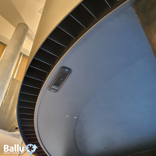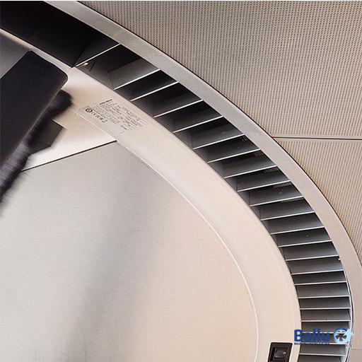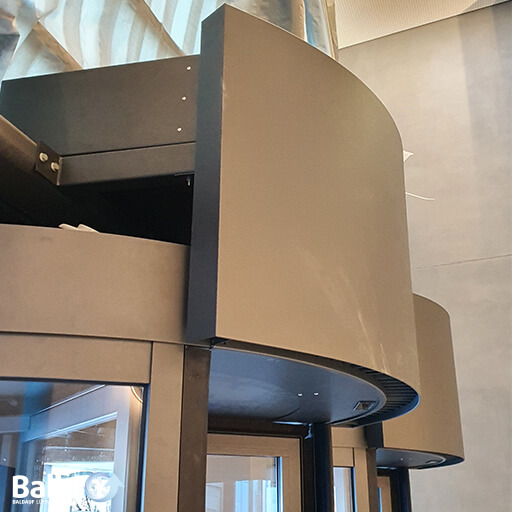 Design-Luftschleieranlage in horizontaler Ausführung für Karusselltüren (wahlweise für den Einbau in den Kranz, oberhalb der Karusseltüre oder in die Systemdecke bzw. außerhalb der Türe); geeignet für Warmwasser Niedertemperaturbetrieb.