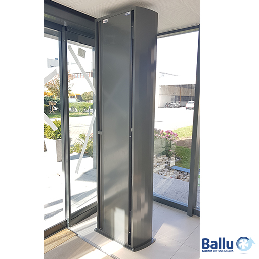 Luftschleieranlage in PREMIUM Gehäuseausführung für stehende Montage (für Rechts- oder Linksaufstellung); geeignet für Elektrobetrieb.