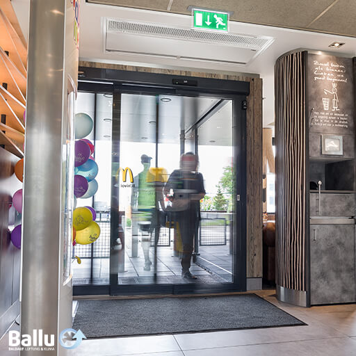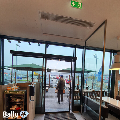 - Raumsensor: Luftschleieranlage schaltet im Automatikbetrieb bei geschlossener Tür auf die kleinste Gebläsedrehzahlstufe (HEIZBETRIEB) und hält die Temperatur im Eingangsbereich konstant.
