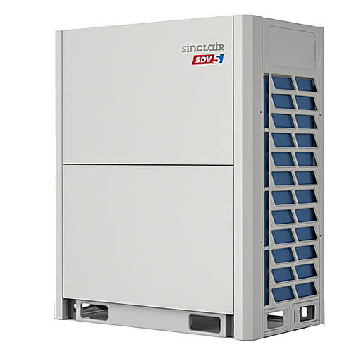 Das SDV4 System ist ein hochenergetisches VRF-System speziell zur Klimatisierung größerer Gebäude. Die SINCLAIR Invertertechnik steht zum Kühlen oder Heizen zur Verfügung. An der Außeneinheit können Innengeräte unterschiedlicher Leistung und Bauart angeschlossen werden. Die Gesamt-Nennkälteleistung der angeschlossenen Inneneinheiten kann durch den zulässigen Gleichzeitigkeitsfaktor von 50% ‑130% betragen.