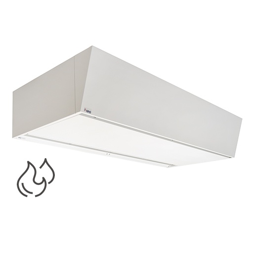 Luftschleieranlage in SUPERIOR XL Gehäuseausführung für sichtbare, hängende Montage; geeignet für Niedertemperaturbetrieb.